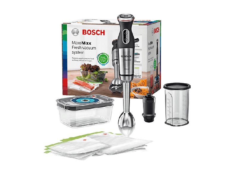 • Caract. especiales : Incluye vaso de mezclas graduado, Cúpula del pie de batidora antisalpicaduras con 4 cuchillas, Accesorio de bomba vacío de 500mbar incluido, Accesorios aptos para el lavavajillas, Incluye tupper de 1 litro para envasar al vacío y 3 bolsas de vacío de 1 litro y 3 bolsas de 4 litros
