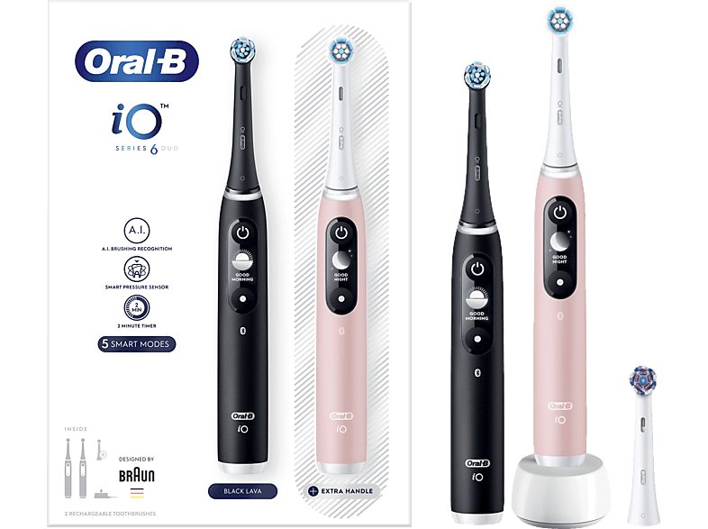 • Contenido de la caja : 2 mangos iO 6 con temporizador de 2 minutos, 1 cabezal Gentle Clean, 1 cabezal Ultimate Clean, 1 cabezal Radiant White y 1 cargador.